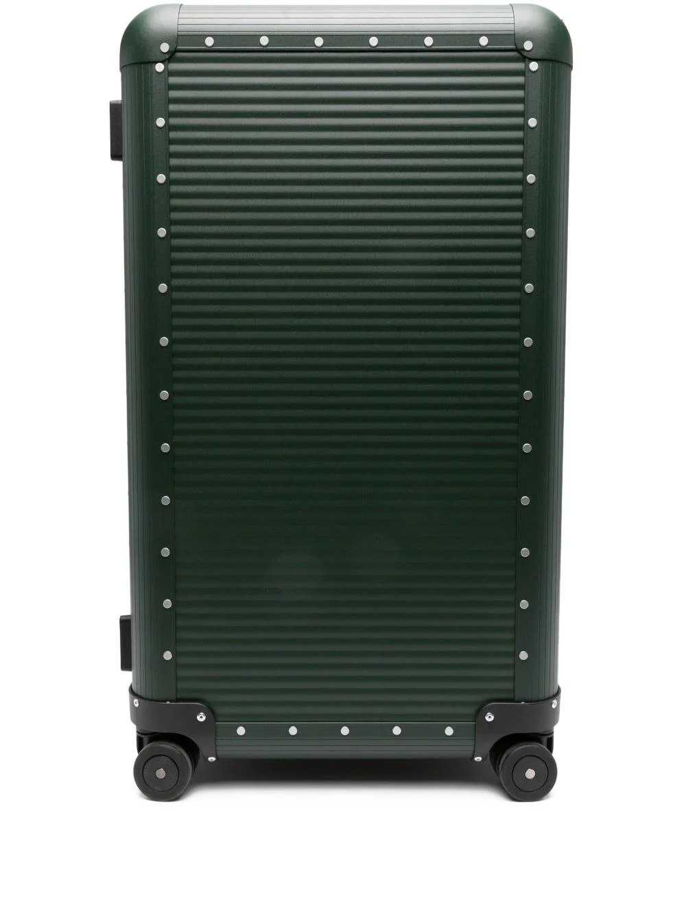 ribbed-panel trolley Highlights - Dark green - Ribbed panel - Metallic studs - Four wheels - Retractable handle Imported Composition Outer: Aluminium 97%, Calf Leather 3% Lining: Polyester 85%, Calf Leather 15%