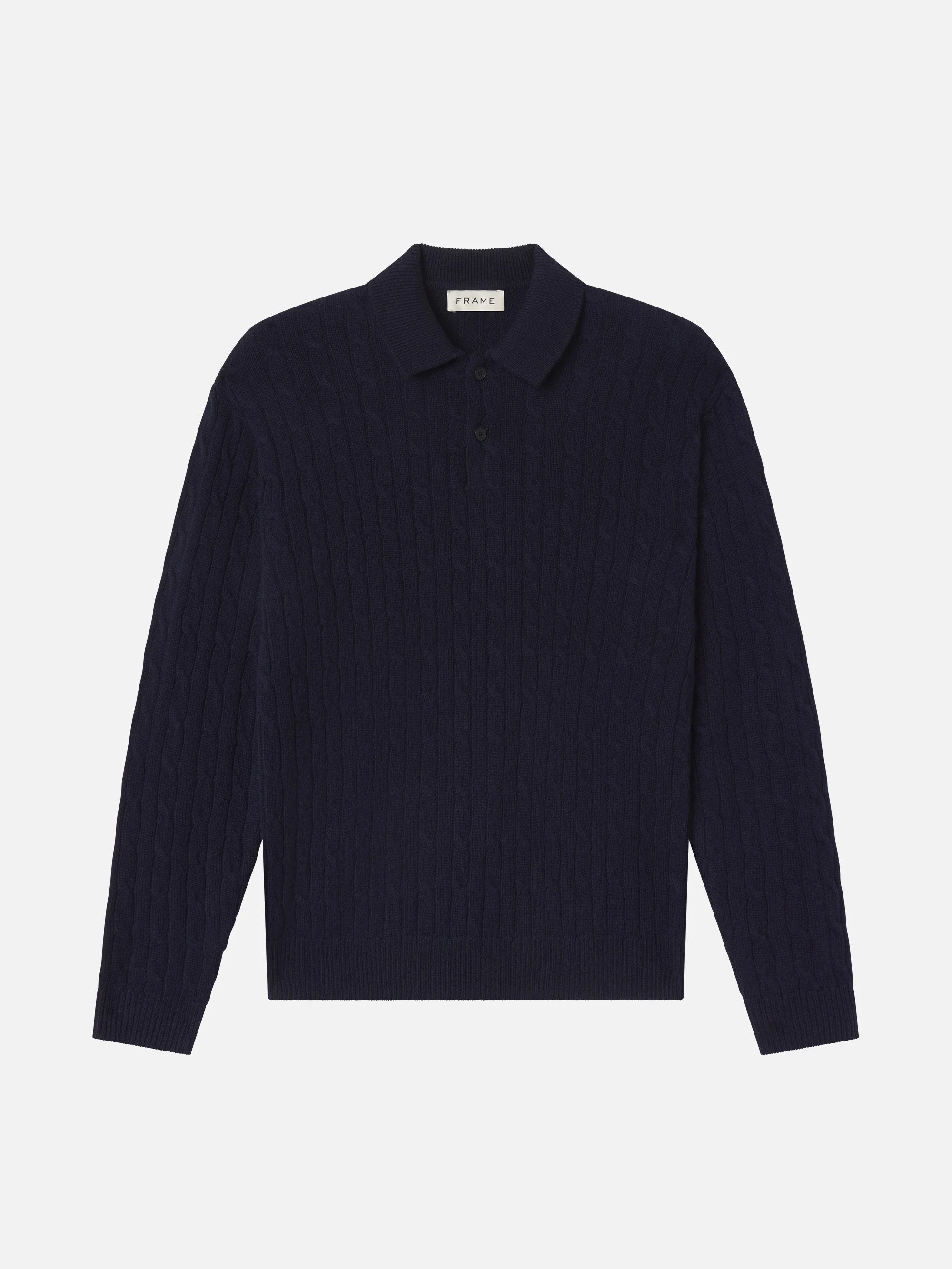 This updated version features the same classic fit and subtle cable detailing as our original crewneck, now reimagined with a refined polo collar for a modern twist. Crafted from a luxurious wool-cashmere blend, it offers the same softness and mid-weight versatility you know and love—perfect for layering or wearing solo. DETAILS - Dry Clean Only - 90% RWS Wool/10% Cashmere - 26.5" Long From Shoulder - MP26KSW004-DKNV