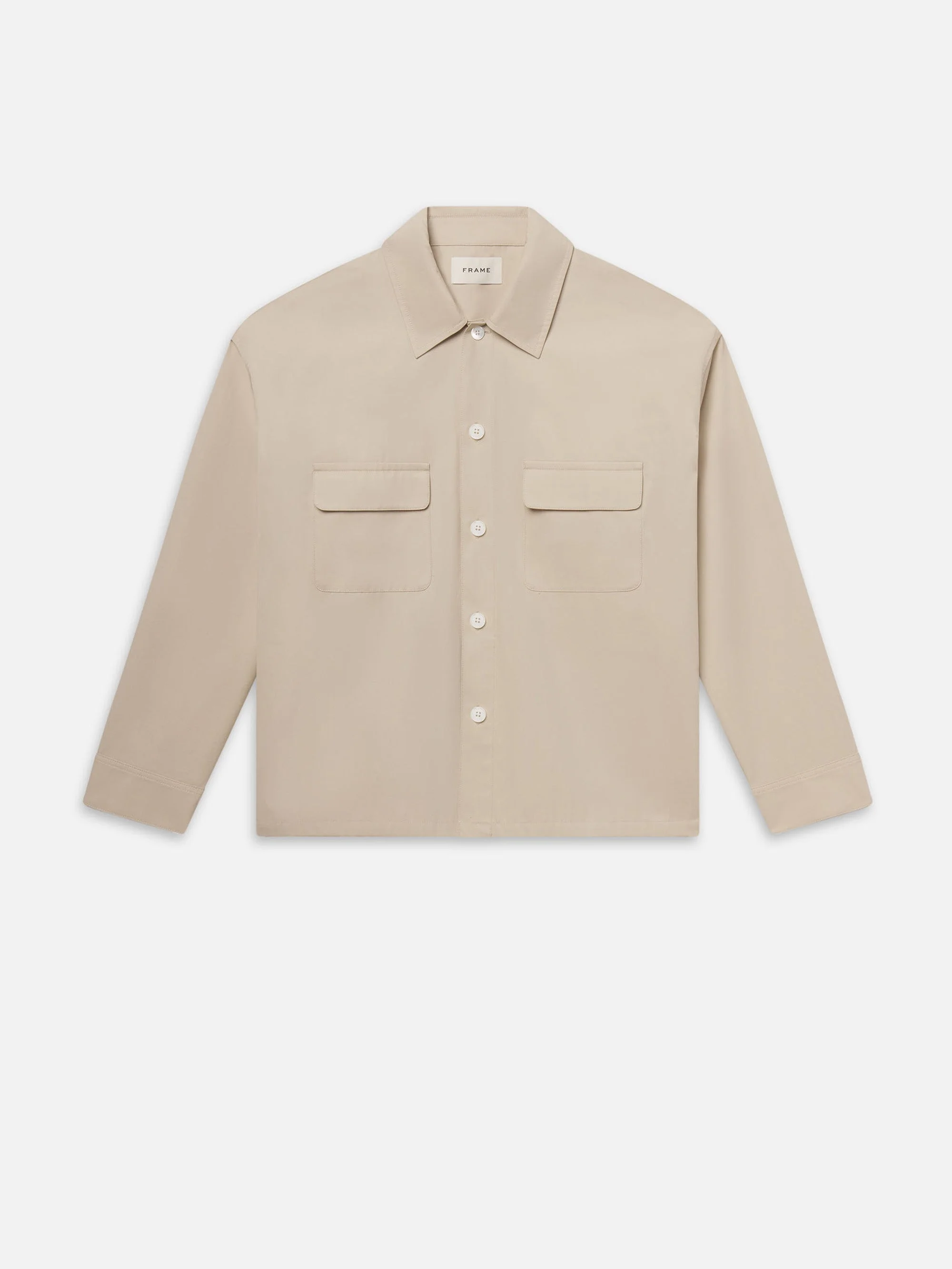 The ease of a shirt, and the functionality of a jacket. Get them both in this clean-cut overshirt. Designed for a slightly boxy fit with dual flap pockets at the chest, this topper effortlessly elevates your classic tee and jean ensemble. Materials & Care Dry Clean Only 100% Cotton 28" Long From Shoulder MS25WSH004-LTBG