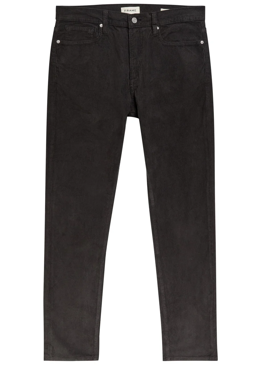 Info & Care Frame;corduroy trousers Belt loops,;three front slip pockets, two back patch pockets Partially concealed zip and button fastening at front 98% cotton, 2% elastane Machine wash cold Size & Fit Inside leg length: 32 inches/ 81.5cm Midweight Tapered, slim-leg cut Model is 6'1"/ 185cm and wears a size;W32
