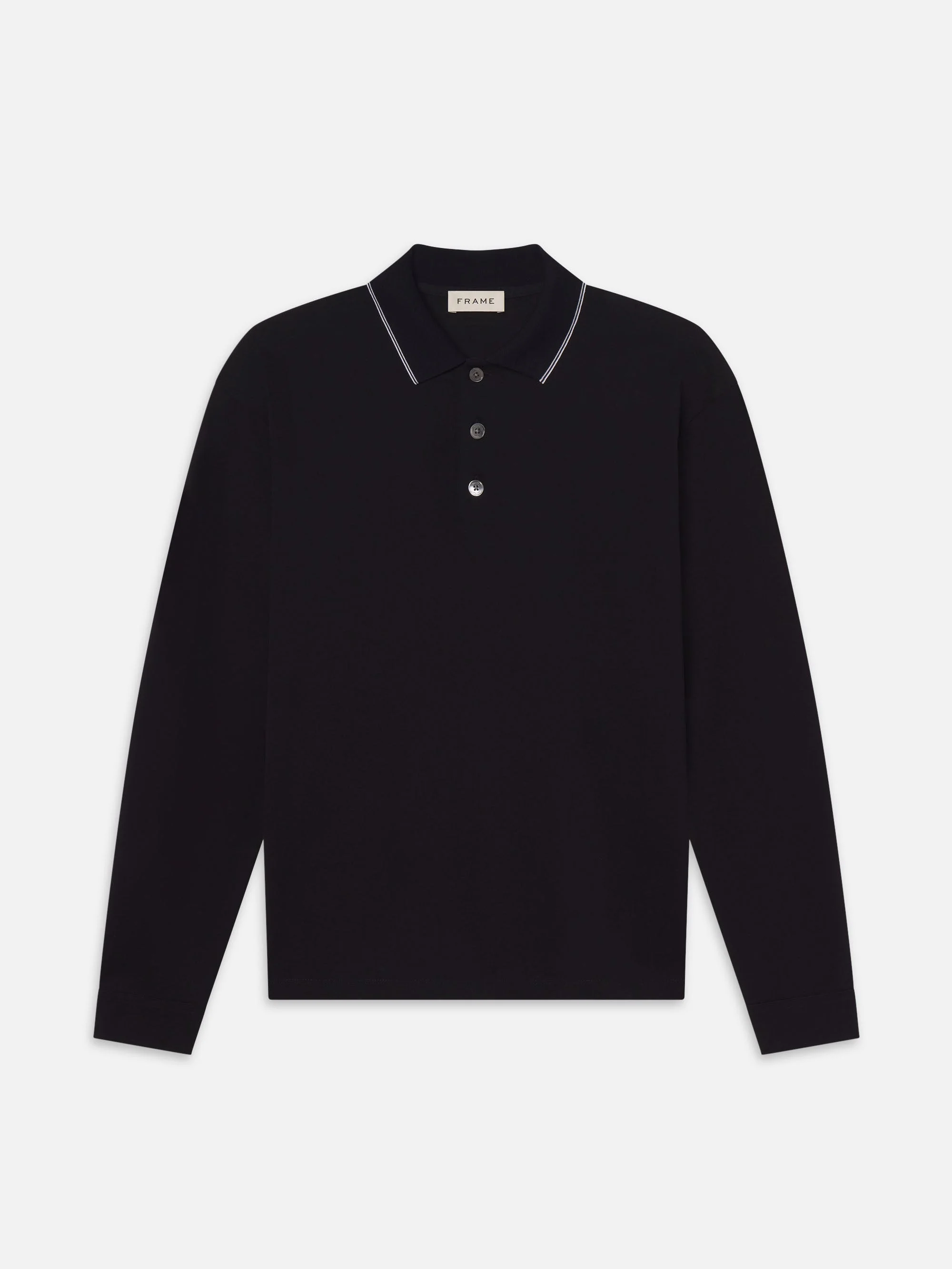 A long sleeve polo built for warmer months. Knit in a lightweight pique that breathes like a tee but carries the structure of a shirt, this elevated essential is finished with a tailored collar, clean cuffs, and a smooth handfeel. Ideal for office layering or solo wear off-duty. Materials & Care Machine Wash Cold 100% Mercerized Cotton 27.25" Long From Shoulder ME25JTE010-DKNV