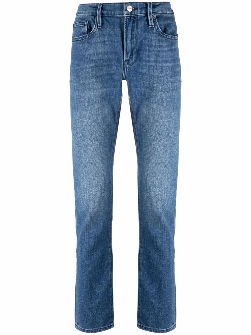 L'home slim-cut jeans denim-blue stretch-cotton blend front button and zip fastening belt loops classic five pockets mid-wash logo patch to the rear slim cut straight hem Imported Composition Cotton 94%, Polyester 5%, Spandex/Elastane 1% SIZE & FIT Model measurements Height 6 ft 2 in(1.88 m) Bust/Chest 36.61 in(93 cm) Hips 35.82 in(91 cm) Waist 27.95 in(71 cm) FittingInformation This piece fits true to size. We recommend you get your regular size Cut for a slim fit Made with a mid-weight stretch fabric