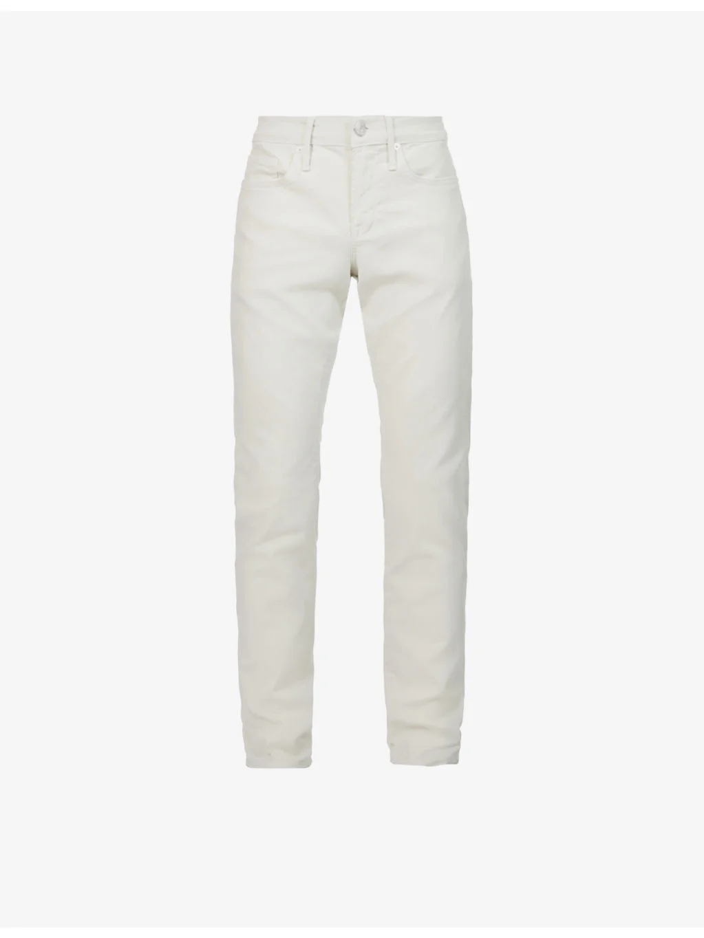 PRODUCT DETAILS - FRAME stretch-woven trousers - 74% lyocell, 17% rayon, 9% elastane - Exposed button and concealed zip-fly fastening at front - Slim fit, mid rise, branded silver-toned hardware, belt loops, five pockets, V-shaped yoke at back, partially lined - Machine wash cold - Size UK 30: rise 10in / 26cm, inside leg 31in / 79cm, leg opening 13in / 33cm - Model is 6ft 1in/1.85m and wears a size UK 30 - Midweight, stretchy Ref: R03946242