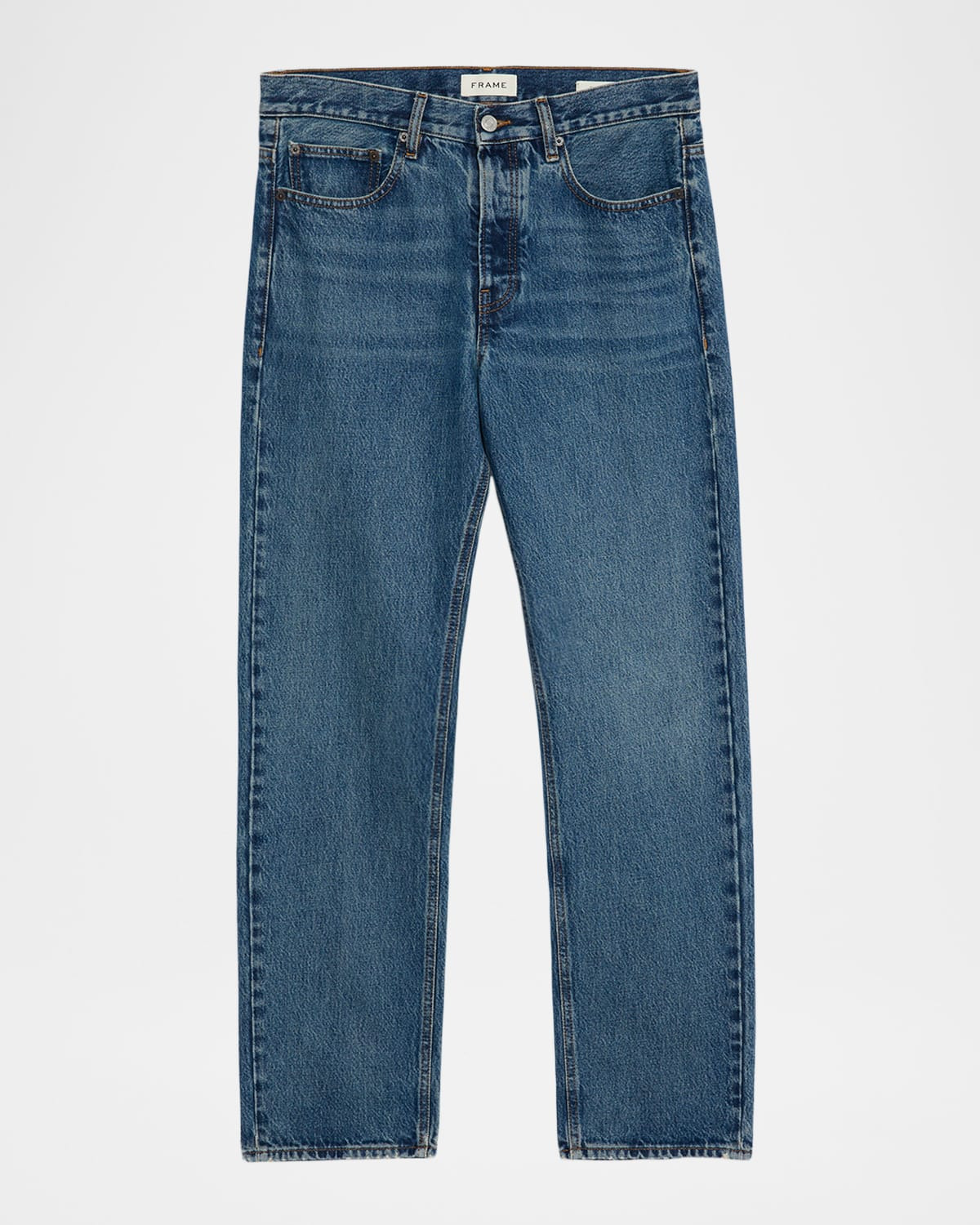 - FRAME jeans in medium-wash denim with whiskering a natural finish - Regular rise - Five-pocket style - Classic fit through straight legs - Button-zip front; belt loops - Cotton - Machine wash cold - Imported