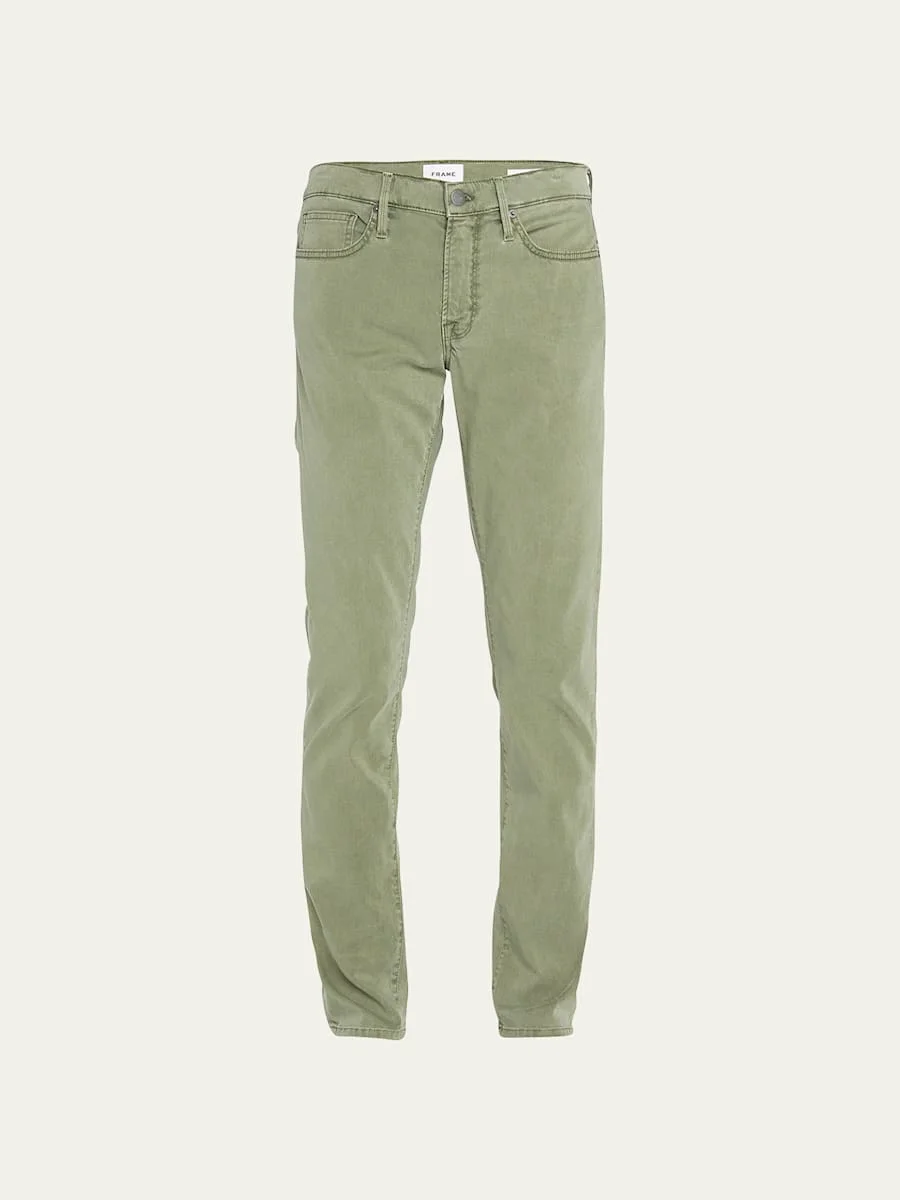 FRAME "L'Homme" pants in a solid stretch fabric Approx. 10” rise; 33” inseam; 14” leg-opening Regular rise Five-pocket style Full length Slim fit through straight legs Button/zip fly; belt loops Lyocell/modal/elasterell-p Machine wash cold, machine wash tumble dry, wash inside out Imported Model is 6'1"/185cm. Online Inquiries: BGS21_N9K9Z| Store Inquiries: #4337967