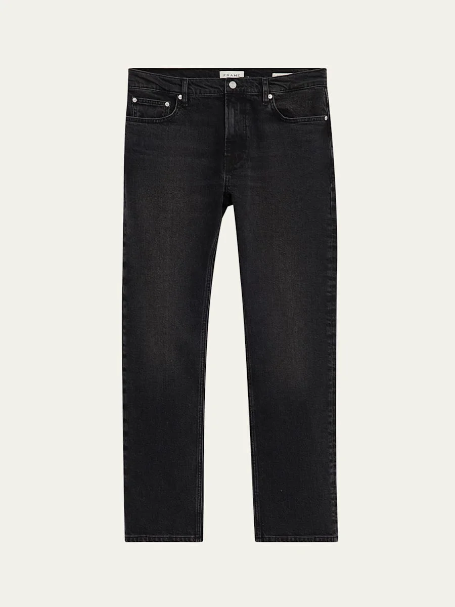 FRAME jeans in cotton denim Regular rise Flat front Fivepocket style Full length Straight legs Button/zip fly; belt loops Cotton/elastane Machine wash cold Imported