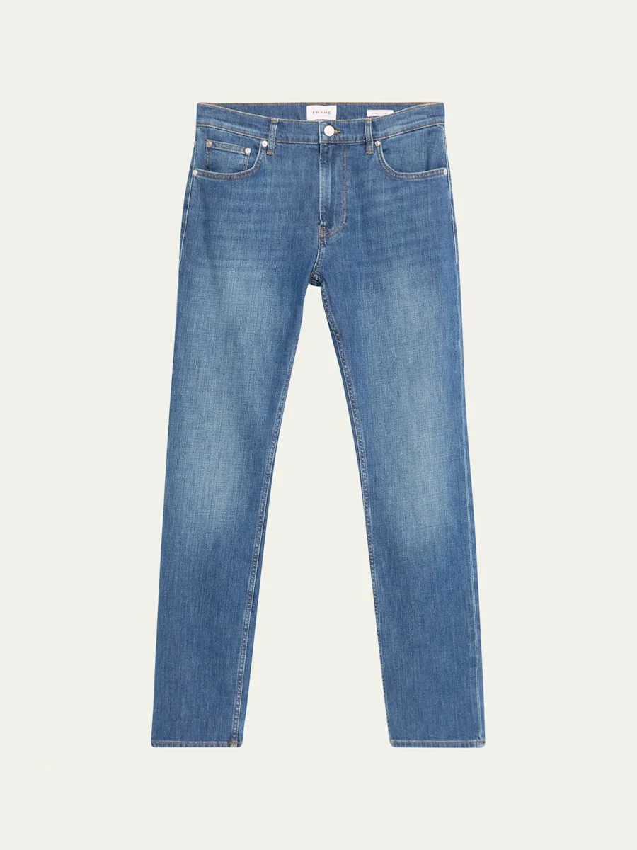 FRAME jeans in dark-wash denim Approx. 32.5" inseam Regular rise Full length Modern straight-leg fit Button/zip closure; belt loops Cotton/polyester/elastane Unlined Machine wash cold Imported Model is 6'1"/185cm. Online Inquiries: BGS21_NBM09| Store Inquiries: #4669434