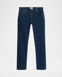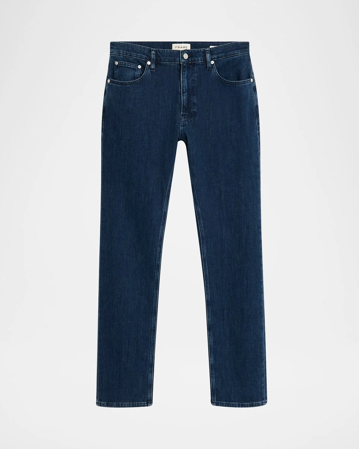 FRAME jeans in darkwash denim Approx. 32" inseam; 11" rise; 15.5" leg opening; 16.9" knee Mid rise Fivepocket style Full length Modern fit; straight legs Button/zip closure Cotton/polyester/elastane Unlined Machine wash cold Imported