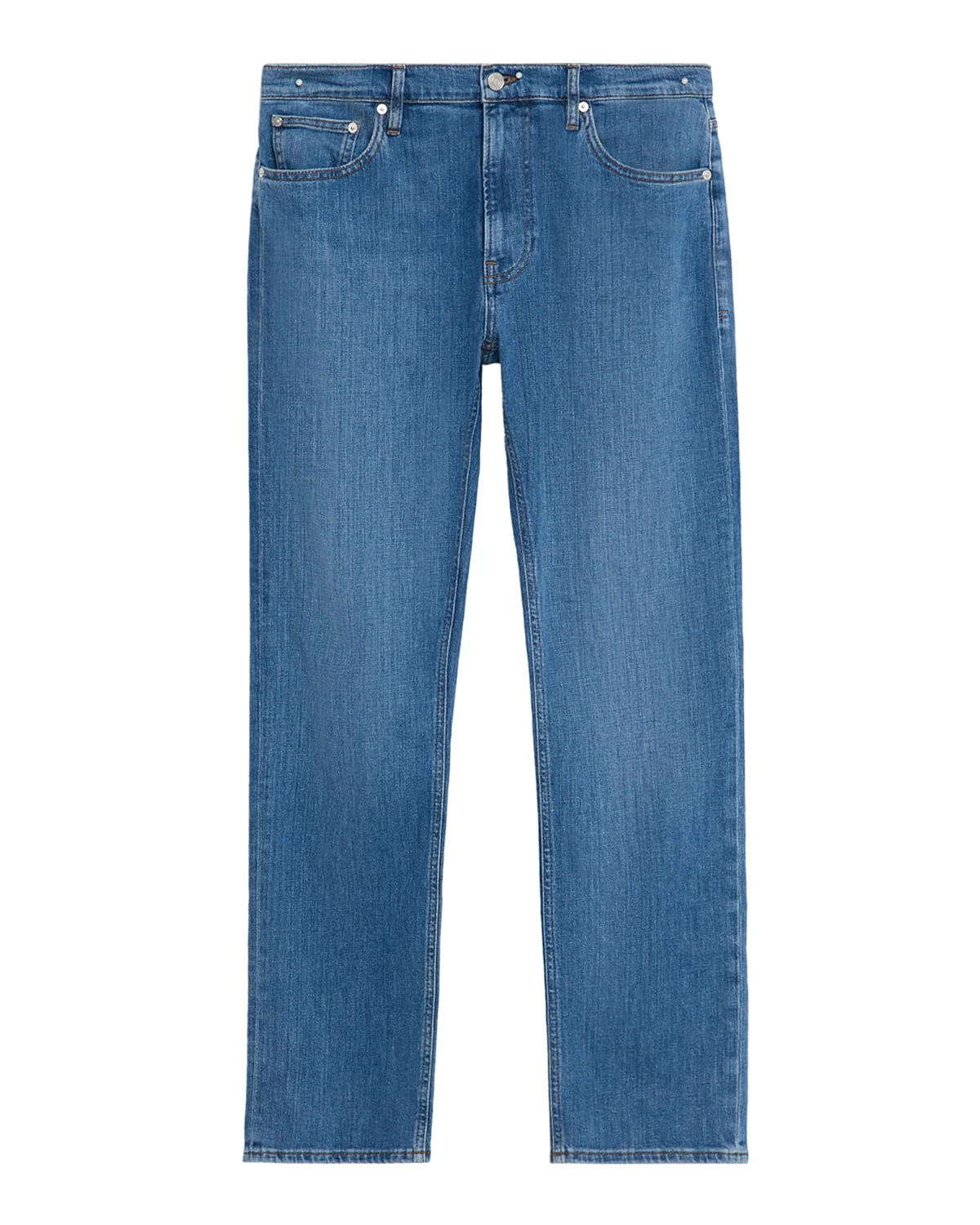 FRAME jeans in darkwash denim Approx. 32" inseam; 11" rise; 15.5" leg opening; 16.9" knee Regular rise Full length Modern straightleg fit Button/zip closure; belt loops Cotton/polyester/elastane Unlined Machine wash cold Imported