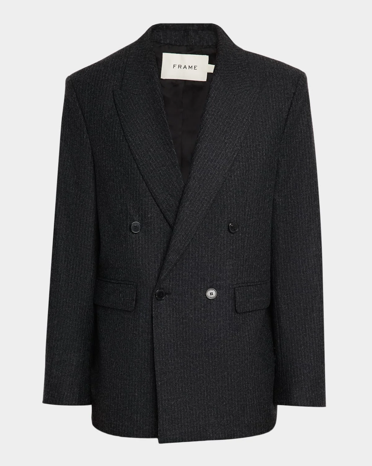 - FRAME tailored blazer in a refined wool blend with subtle pinstripes - Stand collar - Peak lapels - Long sleeves - Two front flap pockets - Relaxed fit - Double-breasted closure - Wool/nylon/polyamide - Dry clean - Imported