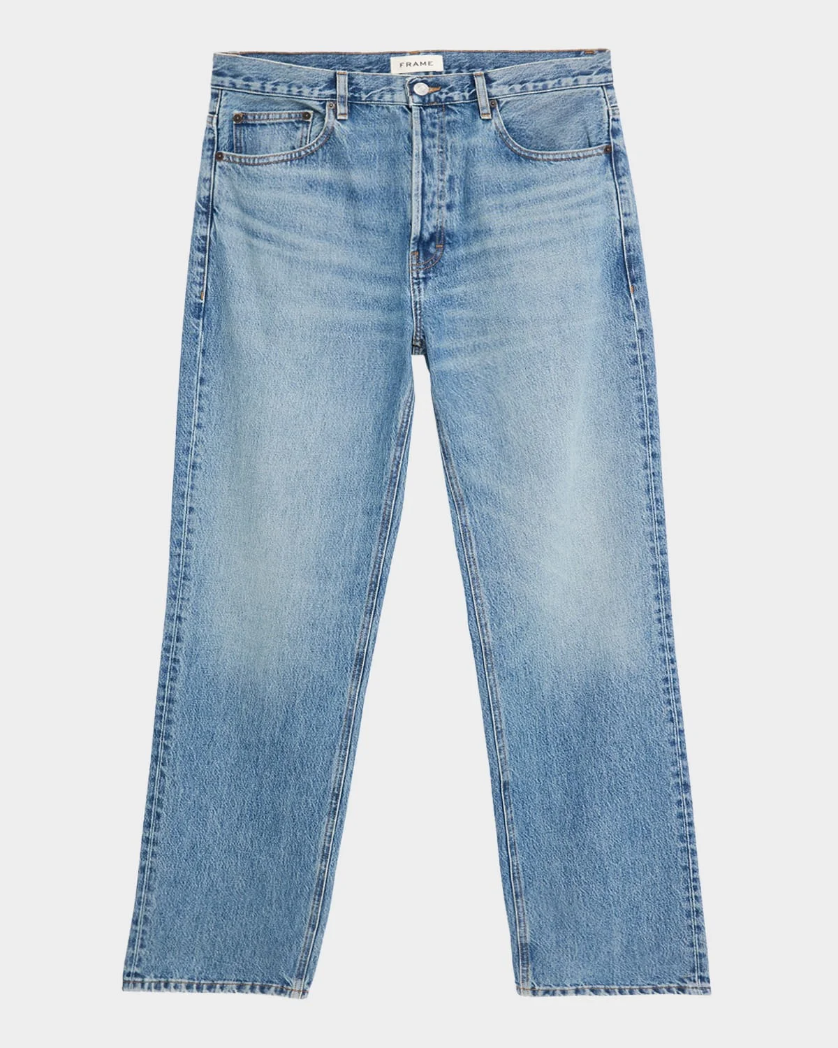 FRAME denim jeans finished in a light blue wash with a livedin look and relaxed shape. Fivepocket style Full length Straight legs Button; zip fly Machine wash cold Imported