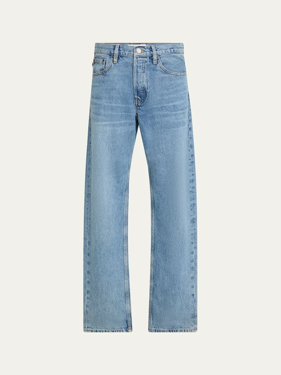 FRAME jeans in light-wash denim Approx. 32" inseam; 11.5" rise; 15.3" leg opening; 18.3" knee Regular rise Five-pocket style Full length Straight legs Button/zip closure Cotton Unlined Machine wash cold Imported Model is 6'1"/185cm. Online Inquiries: BGS21_NCMSA| Store Inquiries: #4802692