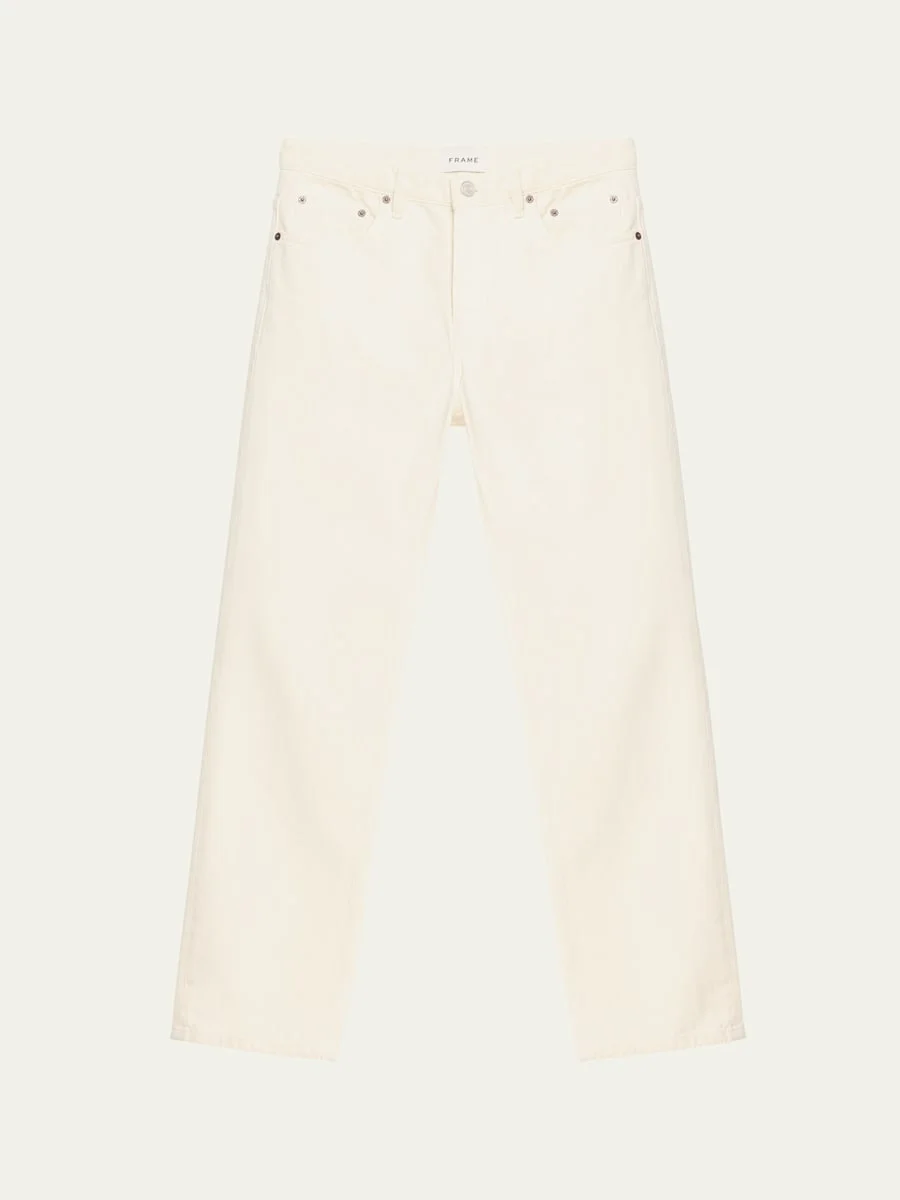 FRAME jeans in solid denim Regular rise Five-pocket style Full length Straight legs Button/zip closure Cotton Machine wash cold Imported Model is 6'1"/185cm. Online Inquiries: BGS21_NBT8A| Store Inquiries: #4713100
