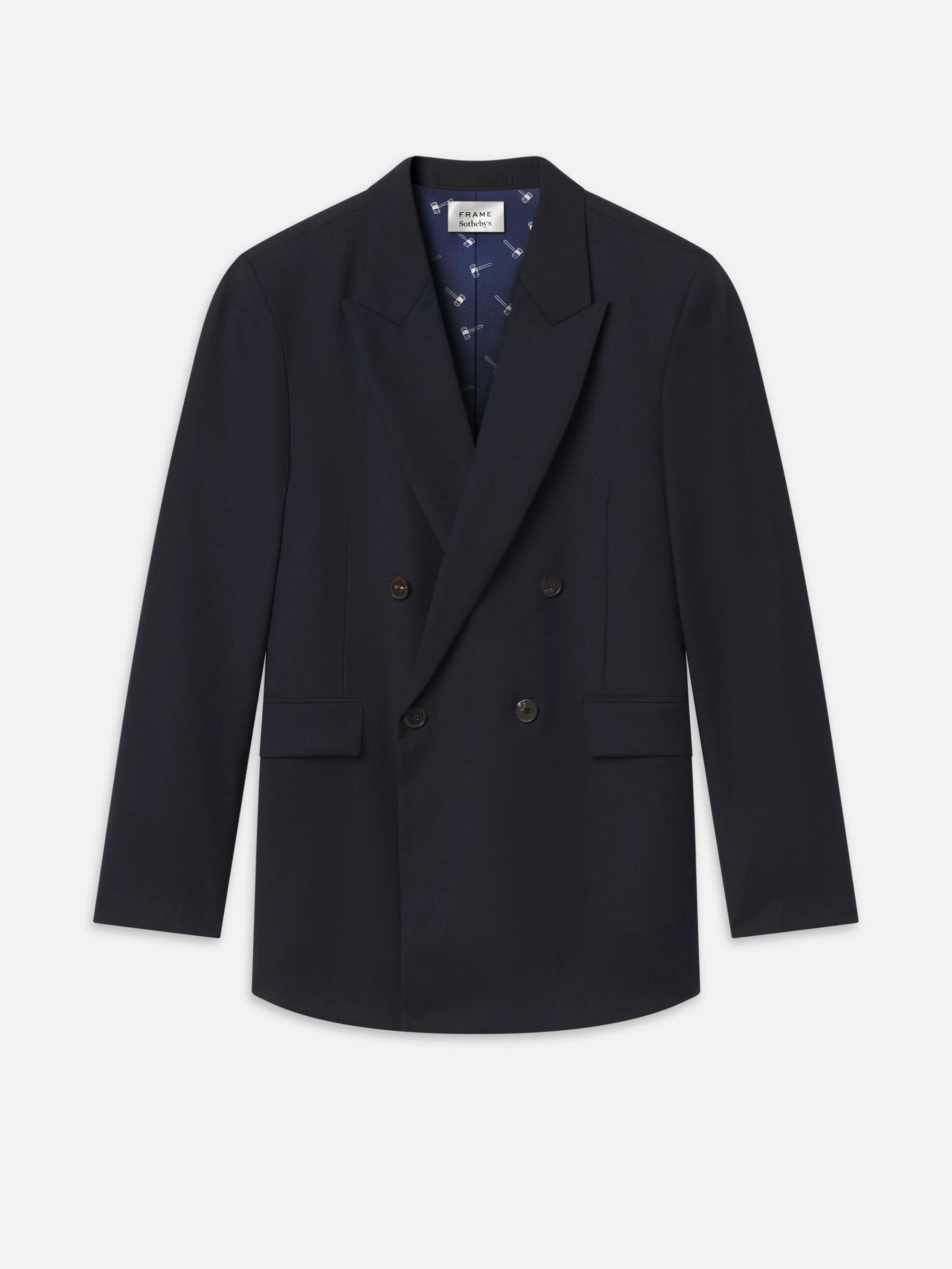 Rooted in tradition, reworked for now. This double-breasted blazer is cut from a structured wool-mohair blend in classic navy, with a straight silhouette, peak lapels, and clean flap pockets. Note the gavel-print lining that mirrors the tie—a thoughtful echo, distinctly Sotheby's. Materials & Care Dry Clean Only 95% Wool 5% Mohair 30.5" Long From Shoulder ME25WBZ010-NAVY