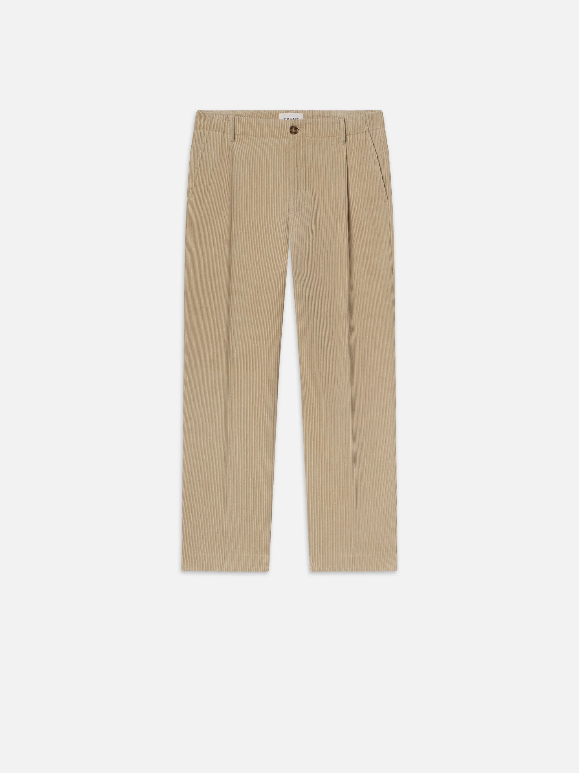 This corduroy trouser elevates the typical work pant with a wearable, light tan wash and crisp pleat down either leg for enhanced volume and movement. Note the tapered silhouette that narrows slightly toward the clean hem. Complete with side pockets, belt loops and a contrast button. Materials & Care Dry Clean Only 100% Cotton 12.5" Front Rise/28.5" Inseam/17" Leg Opening MP25WPA003-DVE