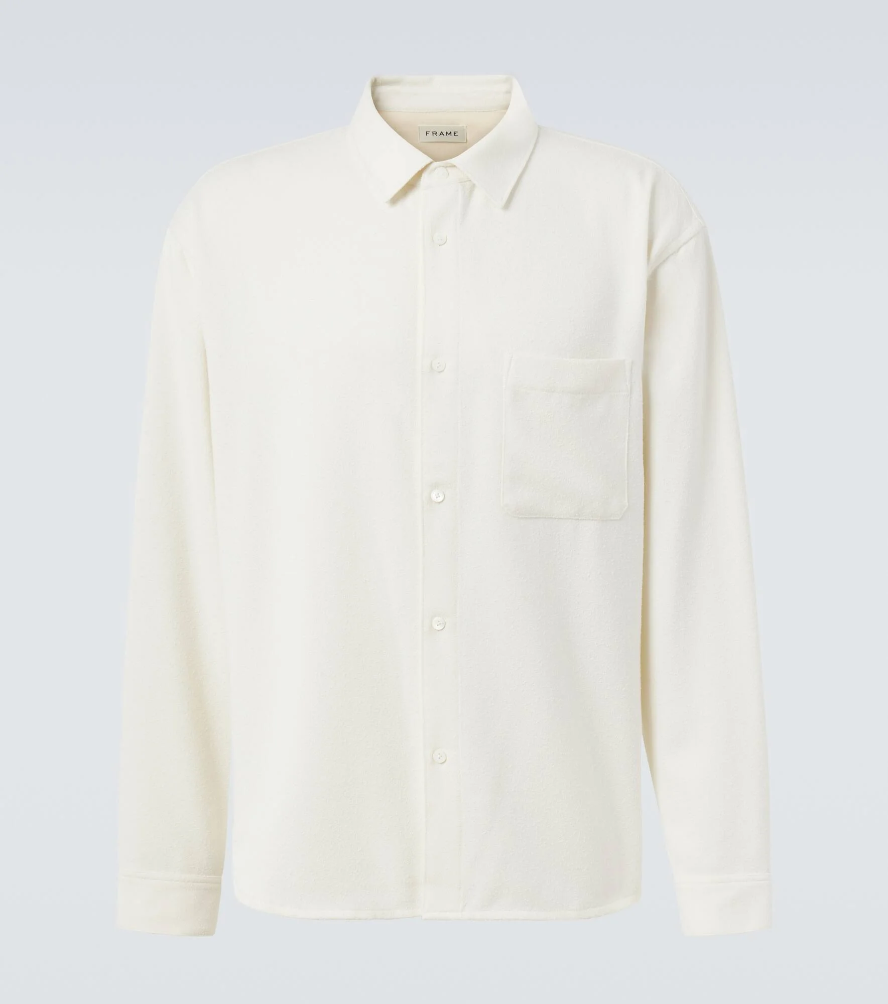 Frame blends laid-back Californian ease with sharp European tailoring – creating timeless essentials designed for modern life. This textured shirt has a timeless style with a buttoned front and front pocket. Product Details - Material: 57% polyester, 25% rayon, 18% nylon - Care instructions: dry clean - Made in China - Designer color name: White Sand - Item color: white - Lining: 100% cupro - Closure: buttoned front - Sleeves: long-sleeved - Item number: P01051331 Size & Fit - True to size - Dropped shoulders - Without pleats in the back - Classic fit - Non-stretchy fabric - Falls below the hip - Height of model is 189cm-74.5" and wears a size L