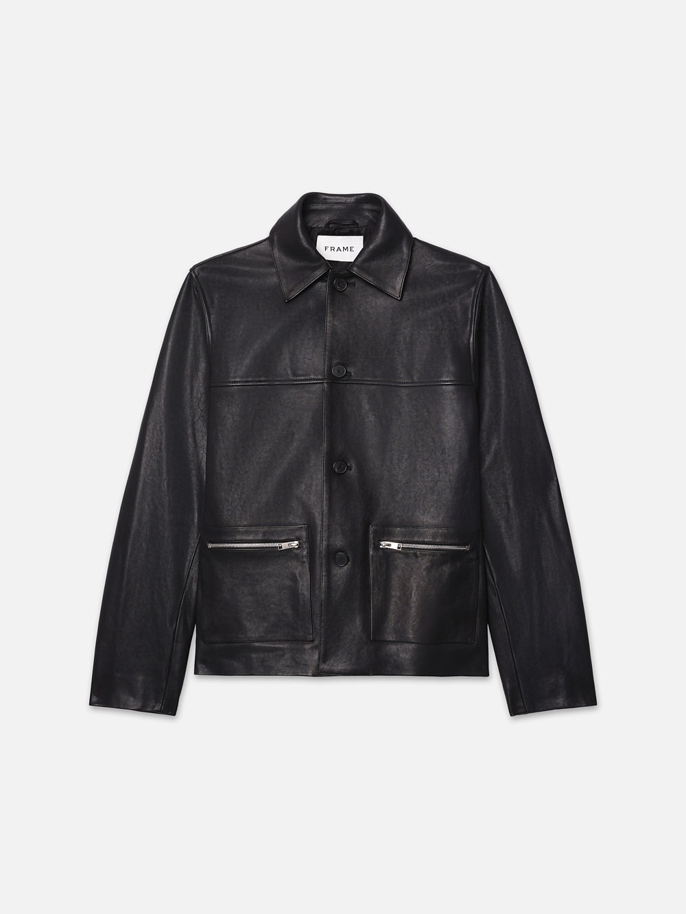 The workwear-leaning utility jacket gets an upgrade thanks to rich lamb leather. Classic features (a pointed collar and patch pockets) meet modern details (exposed zippers). Wear it with jeans or make a statement with matching leather pants. Materials & Care Clean Professionally By A Leather And Suede Specialist 100% Lamb Leather 28.25" Long From Shoulder MS24LJA001-BLK