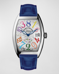 Franck Muller men's watch from the Cintree Curvex Crazy Hours collection Tonneaushaped case in a polished stainless steel Silvertone dial with rainbow Arabic numerals Blue alligator strap with thorn buckle Twohand automatic movement Adjustable length Made in Switzerland