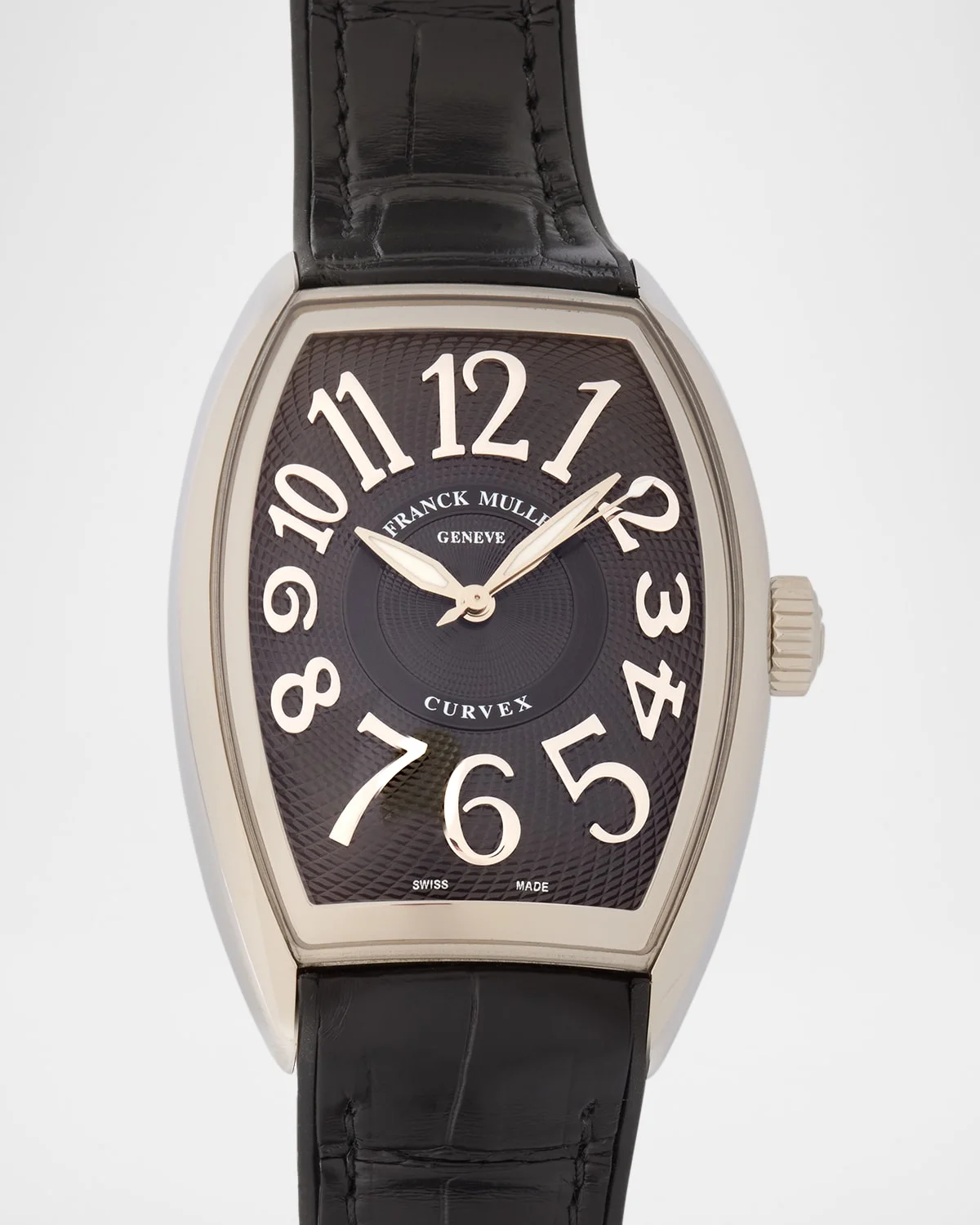 Franck Muller men's watch from the Curvex Collection 40mm tonneaushaped case in stainless steel Black alligator strap with thorn buckle Black dial with Arabic numerals Threehand automatic movement Made in Switzerland