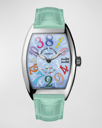 Franck Muller men's watch from the Crazy Hours collection Tonneaushaped case in a polished stainless steel Light blue dial with rainbow Arabic numerals Alligator strap with thorn buckle Twohand movement Made in Switzerland