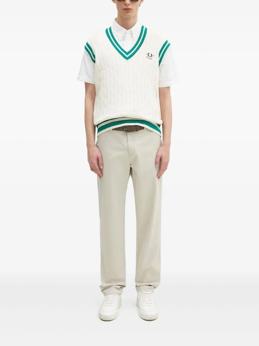 cable-knit V-neck sweater vest Highlights - Off-white - Cable knit - V-neck - Green tipping - Embroidered logo - Sleeveless Imported Composition Cotton 92%, Recycled Polyester 8% SIZE & FIT Measurement LENGTH 27.95 in(71 cm) Washing instructions Read Manufacturer Guidelines