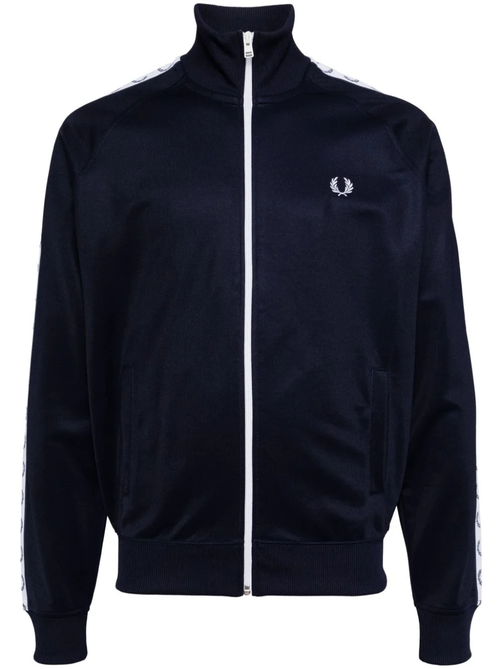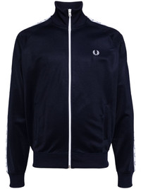 logo-tape sport jacket Highlights - Carbon blue - Recycled polyester-cotton blend - Long sleeves with stripe detailing - Front zip fastening - Embroidered logo at the chest - High neck - Ribbed cuffs and hem Imported Composition Recycled Polyester 54%, Cotton 46%