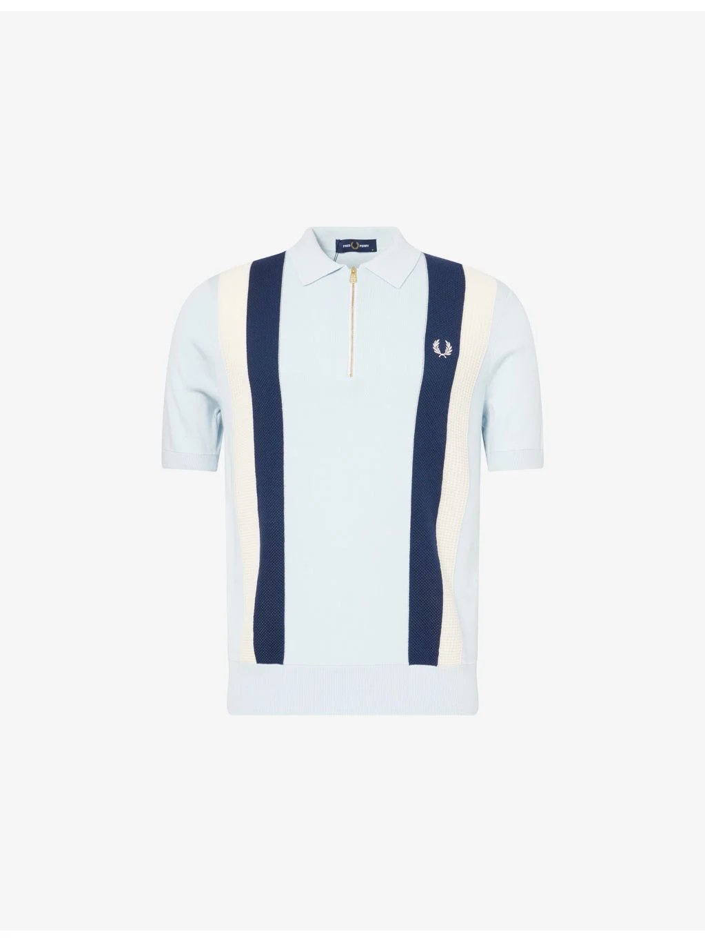 PRODUCT DETAILS - Fred Perry cotton knitted polo shirt - 100% cotton - Zip fastening - Polo collar - Regular fit, collar, short sleeves, logo embroidery at chest, textured stripe knit panels - Machine wash cold - Model is 6ft 2in/1.88m and wears a size medium - Lightweight, stretchy Ref: R04499996