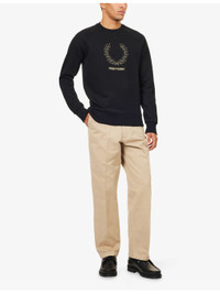 PRODUCT DETAILS - Fred Perry woven sweatshirt - 66% polyester, 34% cotton; trims 98% cotton, 2% elastane - Regular fit, crewneck, raglan long sleeve, brand embroidery at front, brushed interior, ribbed trims - Machine wash at 40°C - Model is 6ft 2in/1.88m and wears a size medium - Midweight, stretchy Ref: R04534292