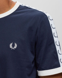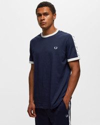 The Fred Perry Taped Ringer T-Shirt in the color Carbon Blue is made of soft cotton jersey. It's finished with contrasting ribbing at the neckline and cuffs, as well as a Laurel Wreath sports band at the sleeve. A signature Laurel Wreath embroidery at the chest completes the design. - Regular Fit - Scoop Neck - Laurel Wreath Embroidery Article Number: M4620-266 Gender: Men Color: CARBON BLUE Material: Full: 100% Cotton