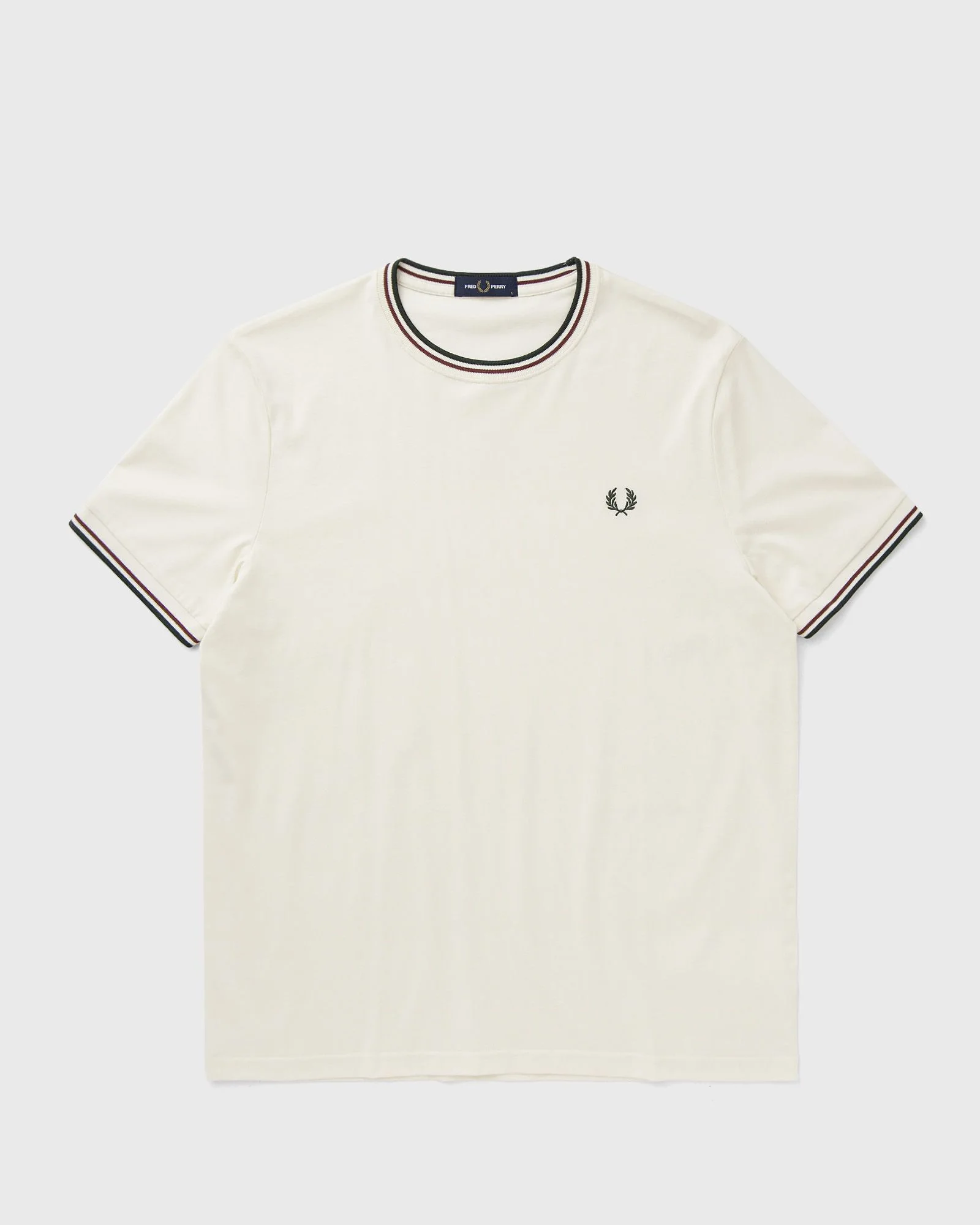 The Fred Perry T-shirt with double stripes combines sporty retro style with modern comfort. Made from soft cotton, it is comfortable and breathable. - Cotton jersey fabric - Regular fit - Crew neck and double stripe cuffs - Contrast color embroidered laurel wreath logo on the left chest - Embroidered Fred Laurel Perry logo on the center chest Article number: M1588V-84A Gender: men Color: ECR/OXBLD/GRSRTS Material: 100% Cotton