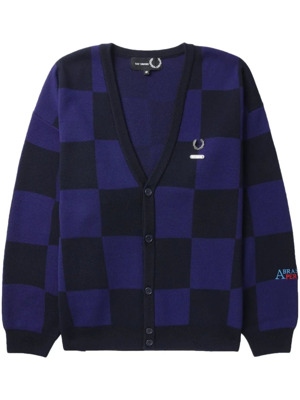 x Raf Simons logo-applique checkered cotton cardigan Highlights - Navy blue/electric purple - Cotton - Fine knit - Check pattern - Applique logo - Embroidered logo at the chest - Plunging v-neck - Front button fastening - Long sleeves - Ribbed cuffs and hem Imported Composition Wool 100% Washing instructions Read Manufacturer Guidelines