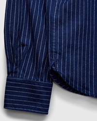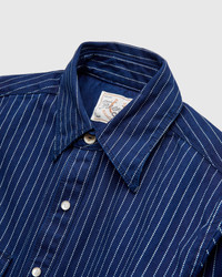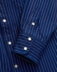 The Bodie is a modified western shirt from Freenote Cloth. Crafted using a 9oz rinsed wabash fabric from Japan, the shirt features a dual acorn chest pockets at the front paired with a western back yoke and mother of pearl snaps. Dyed indigo, this shirt will fade and transform with wear. - Regular fit - Indigo dyed, will fade with wear - 9oz Japanese wabash fabric - Two snap chest pockets - Pearl snap buttons from Japan - Mother of Pearl fisheye top button - Western style back yoke - 1/8" double needle stitch detailing throughout - 100% cotton - Made in USA
