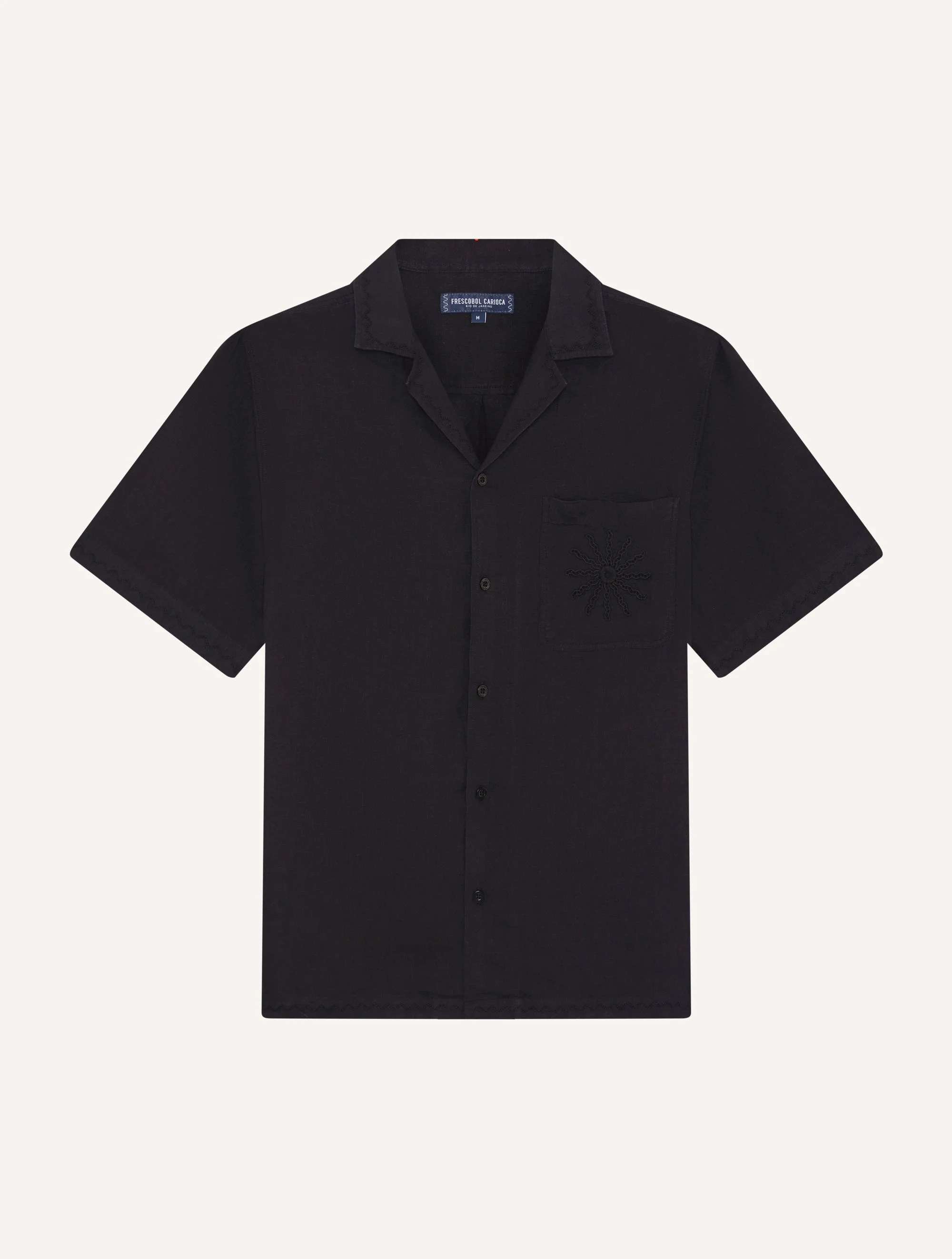 Cut from our signature linen for a relaxed fit, Alves eases the formality of classic shirting with thoughtful artisanal detail. Adorned with seasonal 'O Sol' embroidery on the pocket and featuring a relaxed camp collar with fantasy stitching, Alves is an easy contemporary staple designed to add subtle interest to any look. Product Details COMPOSITION: 100% linen CARE: Machine washable at 30 degrees DETAILS: Seasonal embroidery Relaxed fit Camp collar Chest pocket MODEL MEASUREMENTS SKU 2709-02 Model wears a size M Model measures: Height 6"2, Waist 29.5", Chest 34.5"