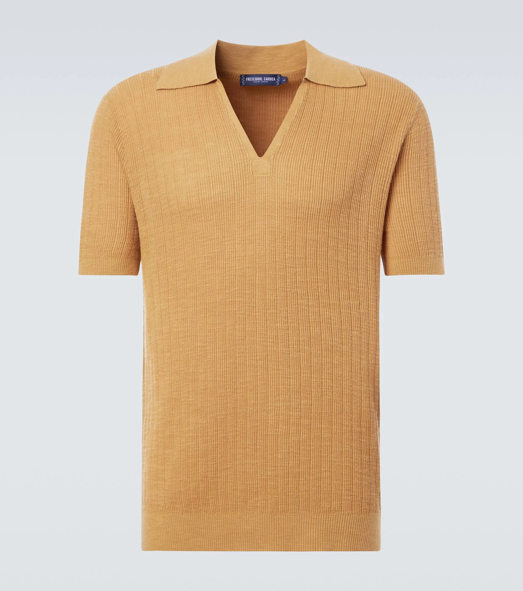Frescobol Carioca translates its Brazilian heritage into creative designs, bringing distinctive pieces for everyday casual wear. The Joaquim polo shirt is cut from a lightweight cotton-blend to a relaxed silhouette and finished with a ribbed-knit motif. Product Details - Material: 50% cotton, 40% viscose, 10% linen - Care instructions: machine wash at 30 degrees - Made in China - Designer color name: Tuscan Sun - Item color: yellow - Collar: V-neck - Sleeves: short-sleeved - Hem: ribbed - Item number: P01061395 Size & Fit - True to size - Straight fit - Stretchy fabric - Falls below the hip - Height of model is 188cm-74" and wears a size M