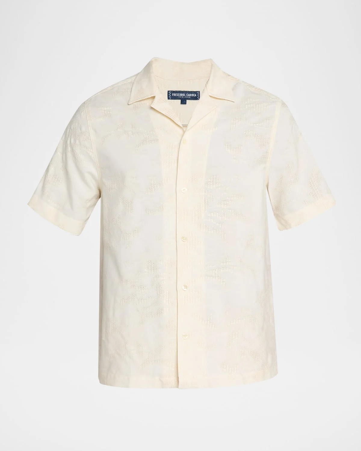 - Frescobol Carioca "Franca" camp shirt elevated with an intermittent jacquard weave, reminiscent of rattan - Approx. 18.1 - "L from shoulder to hem - Notch collar - Button front - Short sleeves; approx. 9.8"L - Box pleated back yoke - Vented sides - Relaxed fit - Cotton/viscose - Unlined - Machine wash cold - Made in Portugal