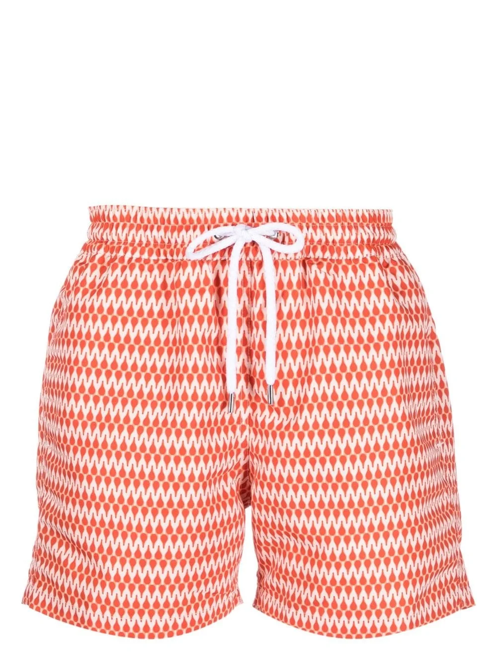 Raquete print swim shorts These Frescobol Carioca swim shorts celebrate Carioca culture with an all-over Raquete print, a motif of the brand's founding product, the Frescobol Beach Bat. Paired with the label's signature Sport silhouette, it is equipped with an elasticated drawstring waistband for added comfort. Highlights - Orange/white - All-over geometric print - Elasticated drawstring waist - Two side seam pockets - Rear welt pocket - Be mindful to try on swimwear over your own garments. Imported Composition Outer: Recycled Polyester 100% Lining: Cotton 100% SIZE & FIT Measurement FRONT RISE 12.99 in(33 cm) INSIDE LEG 4.13 in(10.5 cm) LEG OPENING 25.98 in(66 cm) WAIST 36.22 in(92 cm)