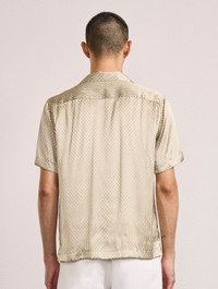 Elevate your wardrobe with Roberto our 100% printed silk shirt, detailed with a relaxed camp collar and designed for the perfect drape. Roberto features bespoke Micro Copa print that plays with scale, layering and rotation to reinvent house calcadao-inspired Copacabana wave motif Product Details COMPOSITION: 100% silk CARE: Hand wash DETAILS: Camp collar Branded button front closure Relaxed/loose fit All-over custom print MODEL MEASUREMENTS SKU 2594-843 MODEL WEARS SIZE M MODEL MEASURES: HEIGHT: 6'2", WAIST 29", CHEST: 33"