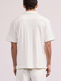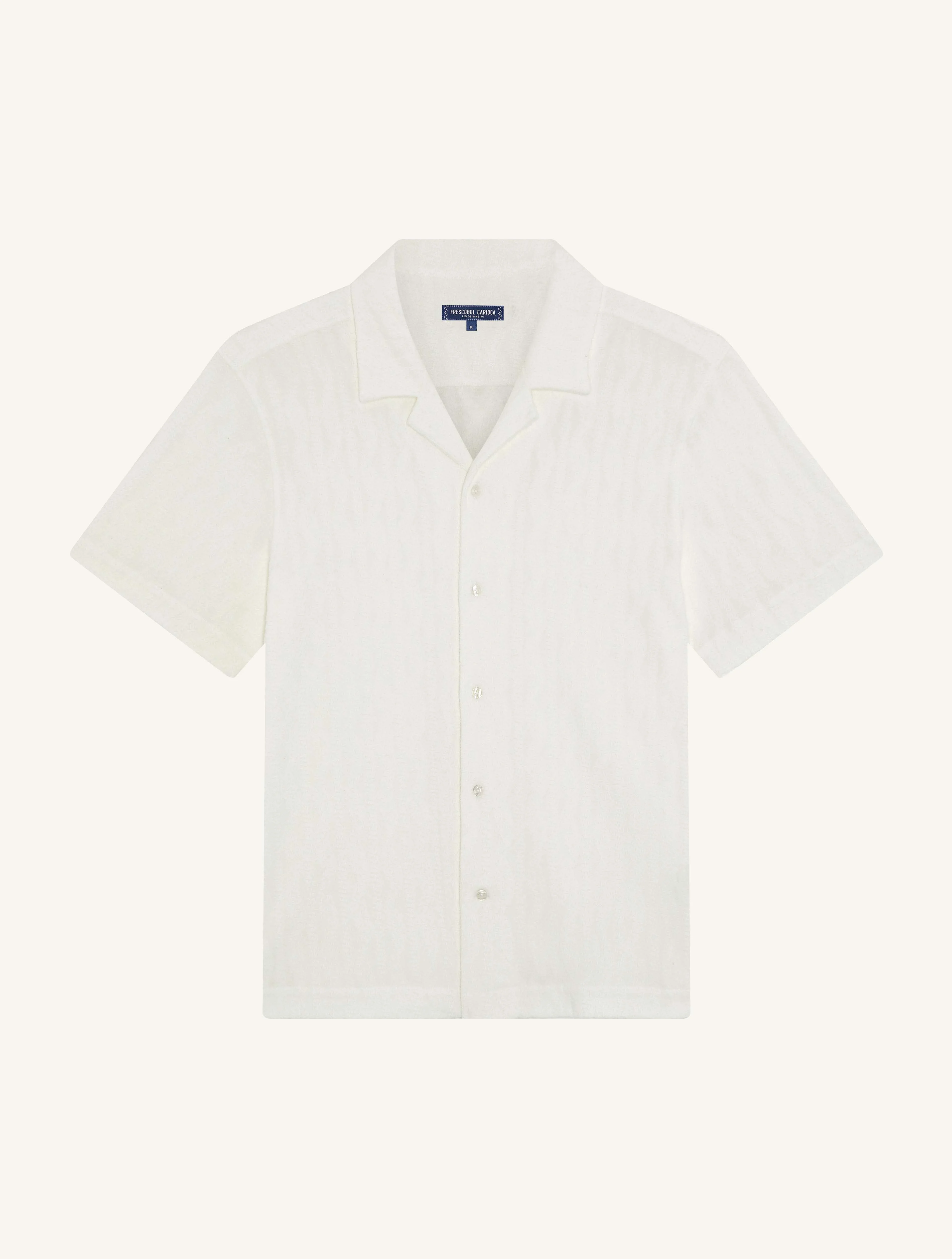 A FRESCOBOL take on warm-weather loungewear, our short-sleeved Roberto shirt is a lightweight organic terry cotton in an intricately crafted jacquard fabrication. Crowned with a camp collar and cut for a relaxed fit, pair with matching Augusto shorts for superior comfort. Product Details COMPOSITION: 74% cotton 22% Lyocell 4% linen CARE: Machine washable at 30 degrees DETAILS: Camp collar Cable knit jacquard Soft touch finish Side slits Relaxed fit MODEL MEASUREMENTS SKU 2673-593 Model wears size M Model measures: Height: 6"1, Waist 31", Chest 39.5''