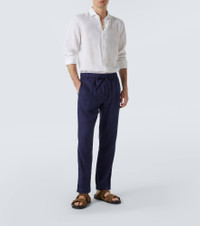 In a tailored fit, these chino pants from Frescobol Carioca come in navy and are crafted from a lightweight blend of linen and cotton, complete with a drawstring waistband. Product Details - Elasticated drawstring waist - Care instructions: machine wash cold - Material: 54% linen, 46% cotton - Designer color name: Navy - Closure: zipper fly, button fastening - Pockets: side slit pockets, back pocket - Made in Portugal - Item number: P00554972 Size & Fit - True to size - Elasticated waist - Adjustable at the waist - Mid-weight material - Straight leg - Inseam length approx: 74cm-29" - The model in the picture is 185cm-6'1" and wearing a size 32