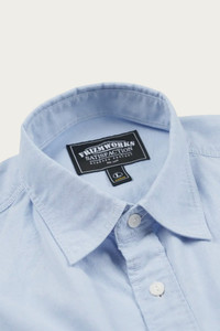 A heritage inspired work shirt cut from sturdy oxford cloth in a light blue tone. Features symmetrical chest pockets with button closures and a clean, structured collar that references early American workwear. The fabric has body without feeling stiff, designed to soften over time. Wear it tucked into wide chinos for a vintage lean, or layered under a chore coat with straight leg denim for a complete workwear uniform.