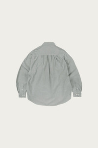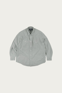 A heritage inspired work shirt cut from sturdy oxford cloth in a muted green tone. Features symmetrical chest pockets with button closures and a clean, structured collar that references early American workwear. The fabric has body without feeling stiff, designed to soften over time. Wear it tucked into wide chinos for a vintage lean, or layered under a chore coat with straight leg denim for a complete workwear uniform.