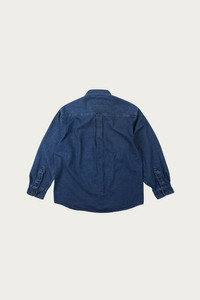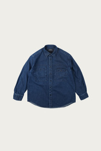 A classic utility shirt cut in mid weight denim with a softly bleached indigo finish. Designed with dual chest pockets, one with flap closure and one with a clean patch construction, nodding to traditional workwear. The wash brings subtle highs and lows throughout the fabric, giving it a worn in feel from day one. Relaxed through the body with an easy drape that works layered or on its own. Style it open over a white tee with fatigue pants, or buttoned up with dark denim for a tonal workwear look.