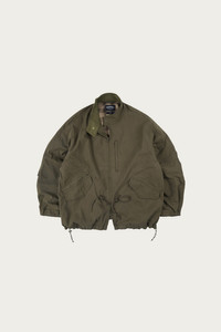 A hybrid jacket that blends the clean lines of a Harrington with the utility of an M65. Zip front with snap placket, stand collar, and adjustable hem. Finished with angled front pockets and a subtle military shape. The olive tone leans classic and versatile. Strong layered over a chambray or oxford with relaxed denim and boots.