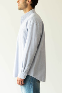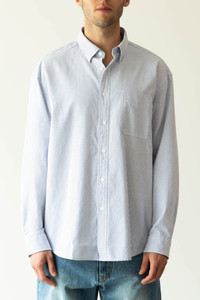 This shirt is constructed with light, soft oxford fabric. It has a relaxed silhouette with a lowered neckline, fewer details, and a casual look. After sewing, it underwent a process to reduce shrinkage and retain the natural feeling. A basic and comfortable piece, it is crafted with the finest fabric and delicate stitching. Fits true to size. Model is 6'2, 150lbs, wearing size L. - Cotton Fabric - Lowered Neckline - Washed and Processed for Soft Hand - Comfortable Fit - Single Pocket - Blue