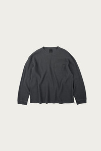 A textured waffle knit tee finished in a washed charcoal tone. The pigment dye gives it a lived in feel, while the pocket and textured surface add dimension to a simple shape. Strong with black or indigo denim and boots, or worn under a chore coat for tonal layering. An easy piece that adds texture without trying too hard.