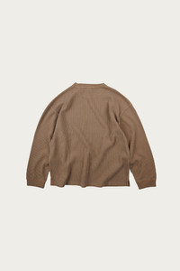 A textured waffle knit tee finished in a soft pigment dyed tan. The fabric has natural depth and variation, with a single chest pocket and subtle side slits for movement. Comfortable with a relaxed drape and slightly dropped shoulders. Pair with olive fatigues and sneakers for an easy daily uniform, or layer under a field jacket with dark denim.
