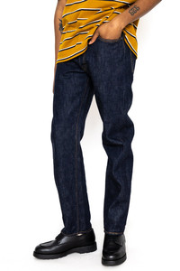 - Color: Genuine Indigo - Fit between 1101 and 1108. The thigh is close to 1108, and the under the knee is close to 1101. - Slanted back center belt loop - Fabric: 13.7oz Fullcount Original Japanese Selvedge Denim - One Wash - 100% Zimbabwe Cotton - Goat Skin Leather Patch - 100% Cotton Thread Sewing Construction - Made In Japan - Style #: 1103 - Model is 6ft wearing a size 30