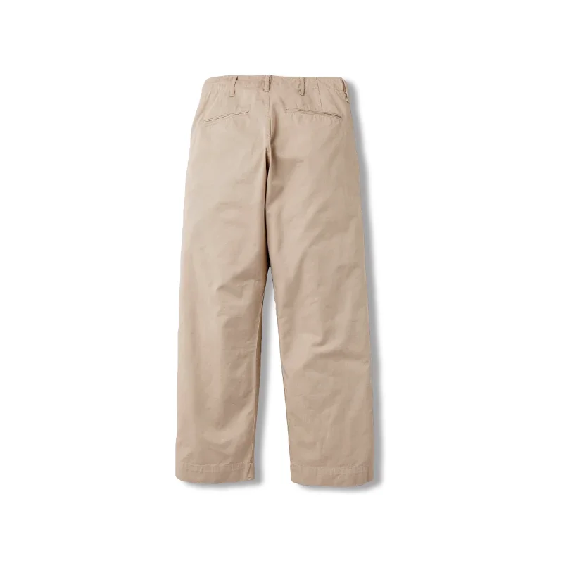 Full Count's 1201 Army Chinos are an accurate reproduction of vintage examples of the U.S Army Chino, which has been a core piece of military gear since the early 1940s. These repros are intentionally crafted, featuring double stitch winding, side slash pockets, rear welt pockets, a loose silhouette, and plenty of reinforcements along the seams and pockets. For these trousers Full Count is using a traditional chino cloth, woven from very high-quality combed cotton with an excellent luster quality, acheieved by thoroughly removing short fibers from the weave, leaving only long-staple yarns. Like a pair of jeans, the more you wear it, the more the fabric's depth of texture will improve, so the vintage 41KHAKI chino will improve with age and wear, shaping to your body and lifestyle. - 100% cotton - Combat chino cloth - Wide straight cut - Two front slash pockets - Two rear welt pockets - Welted fifth pocket - Made in Okayama, Japan Size up from your usual size