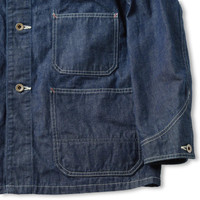 This is a WWII-style chore jacket, featuring simplified details and a boxy cut with a shorter length than most chore coats. It is crafted from a Full Count original Japanese denim that reproduces the look and feel of deadstock military denim, weighing in at 10.5 ounces with a soft, dry hand. The jacket is cut with two half-lined waist pockets and a single small chest pocket, all with pale red bartack reinforcements, classic white stitching, and aged five-star donut buttons. - 100% cotton - 10.5oz rinsed Japanese denim - 2015-1 Chore Jacket - One small chest pocket - Two lined waist pockets - Red bartacked pockets - Aged five-star donut buttons - Shuttle woven in Okayama, Japan We recommend to size up from your usual size