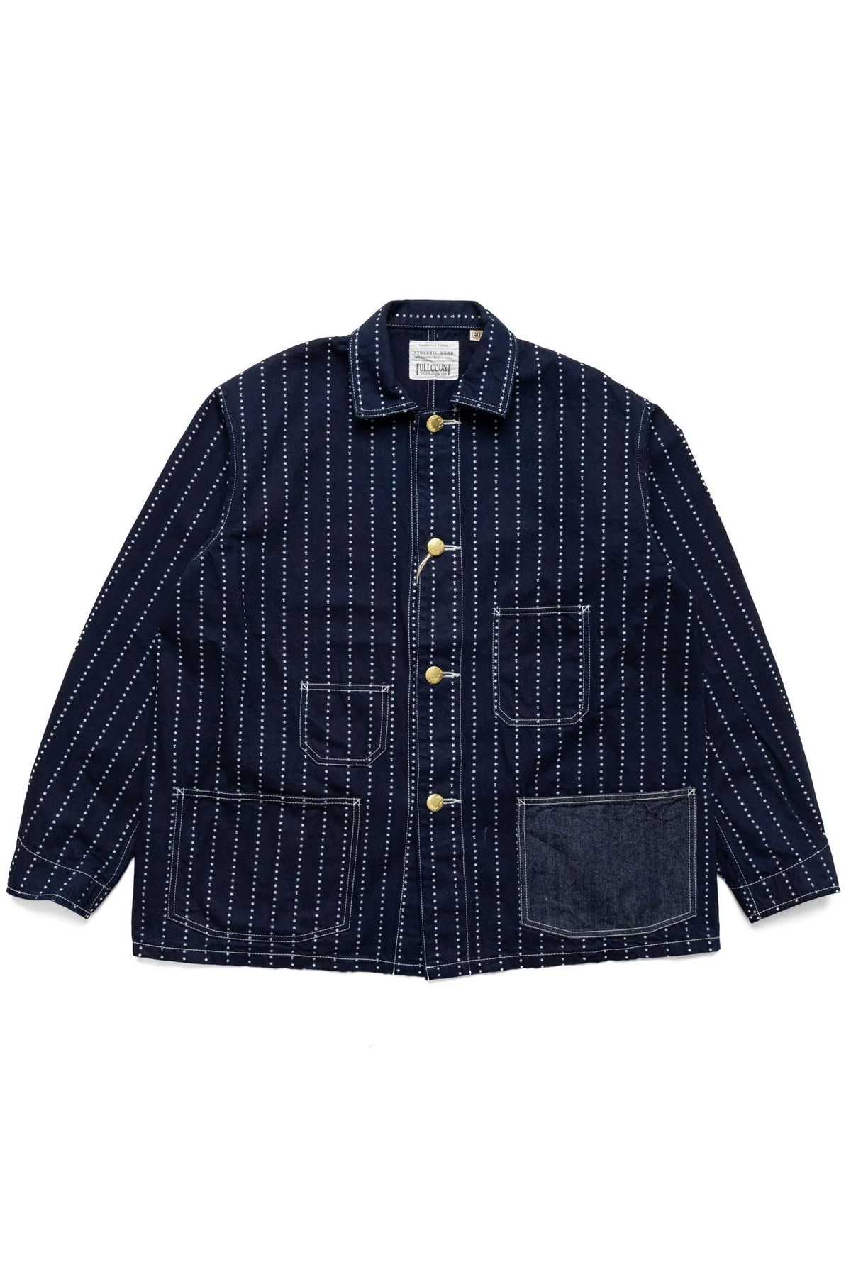 - Original indigo-dyed wabash twill - Star pattern wabash stripe - A chore jacket with an early 1900s A-line silhouette - Asymmetric pockets - Classic details such as a change button - The denim on the left pocket is a reproduction of Amoskeag’s legendary 11oz denim that was made in the 19th century - Color: Indigo Wabash - 100% Cotton - One wash - Made In Japan - They fit smaller than normal US sizing - Model is 6'2 wearing a size 40
